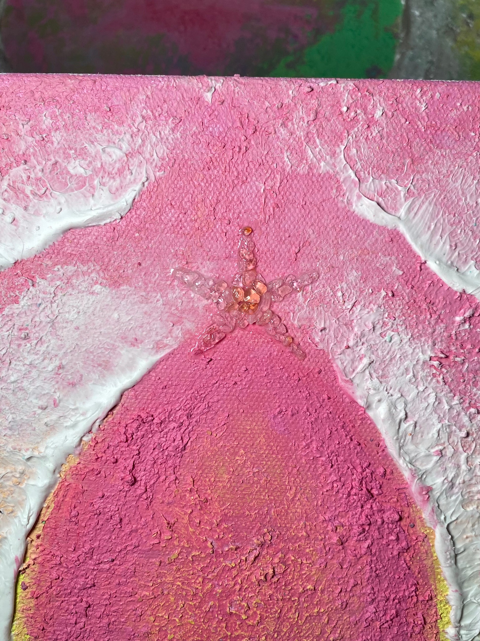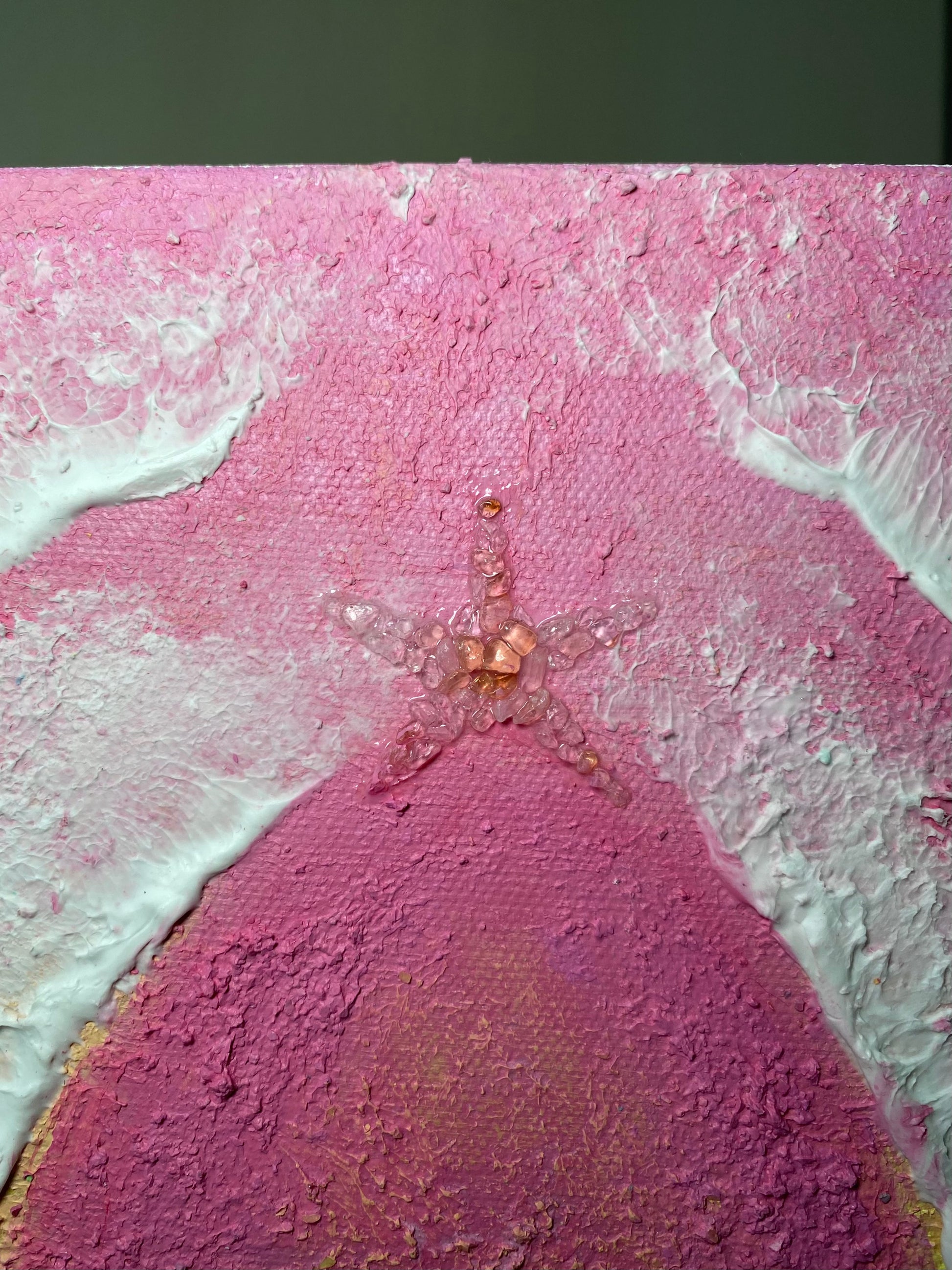 Acrylic paint, flexible modelling paste, clear crystal quartz, rose quartz, citrine