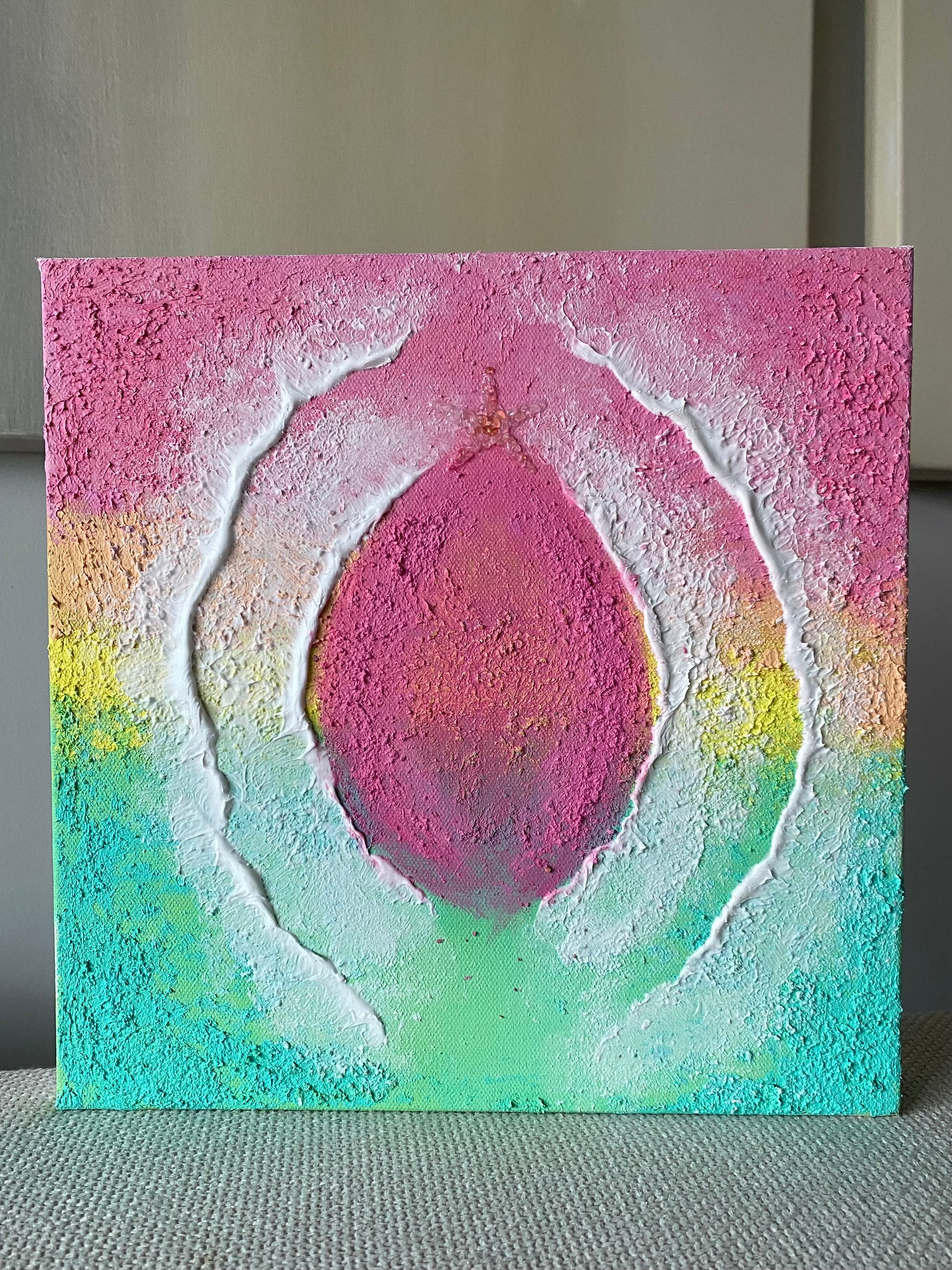 The distinctive background texture emerges through flexible modelling paste combined with clear crystal quartz, adding organic depth to the canvas, where radiant aqua turquoise, sunny yellow, pink, fresh green, and hints of orange blend across raw textures shaped by the earth.